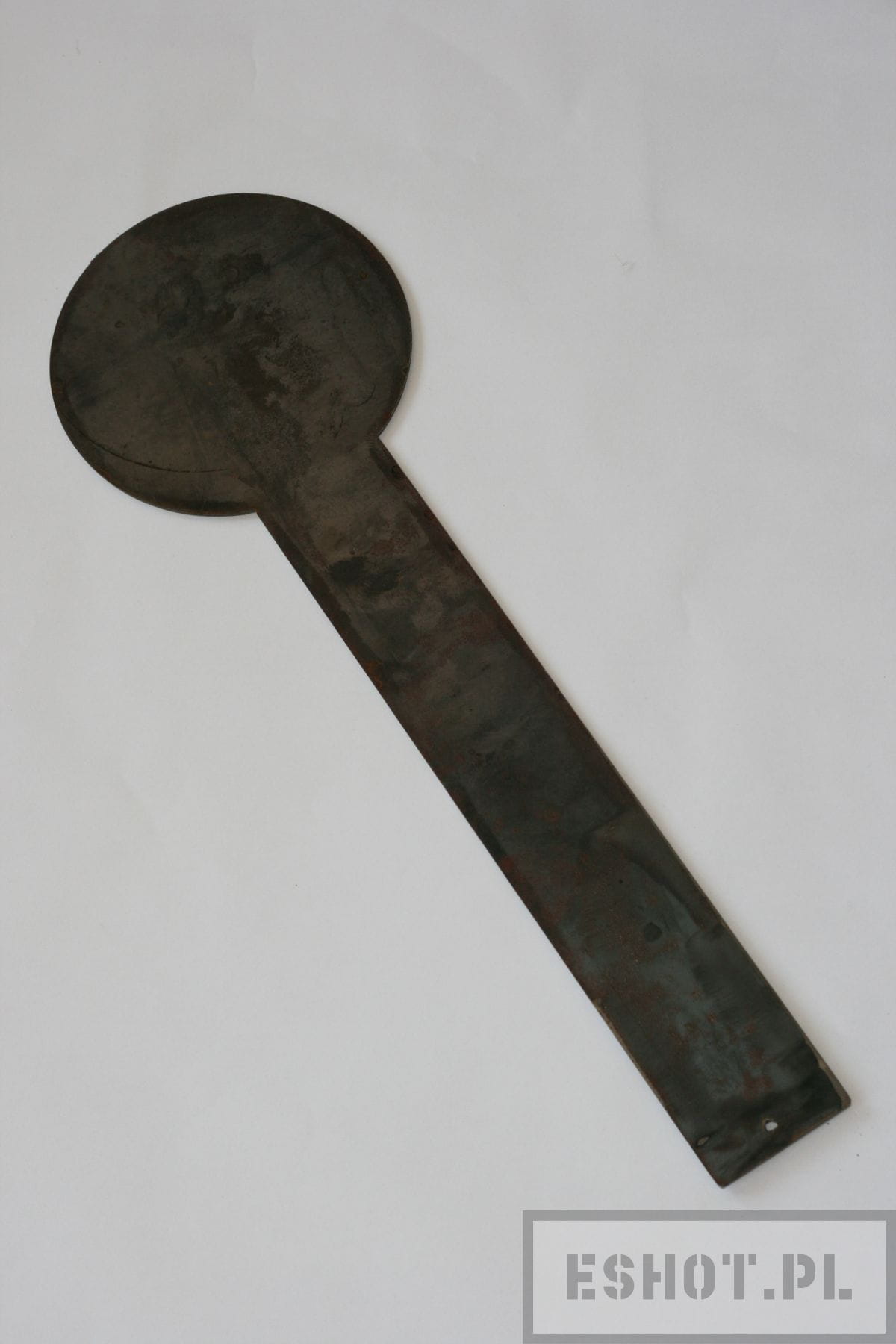 Cel w kształcie koła połączonego z prostokątnym pasem. Wykonany z blachy stalowej o grubości 3 mm. Średnica koła 18 cm. Długość prostokątnego pasa 41,5 cm . Posiada otwór do zawieszania na łańcuchu.