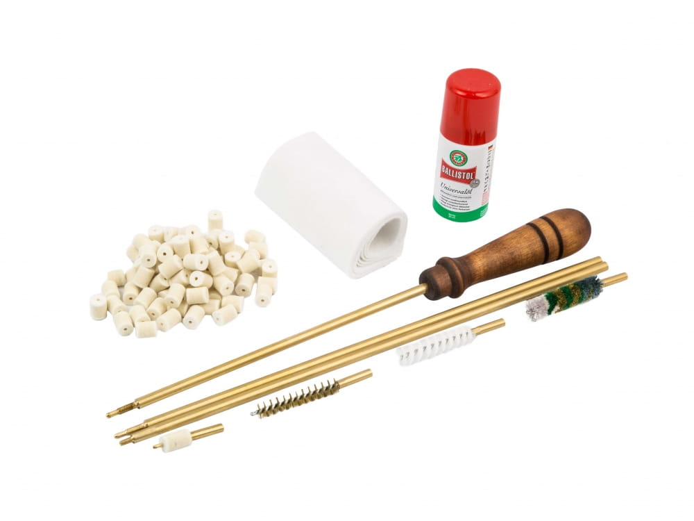 W skład przybornika wchodzi: wycior do broni kulowej składany 3-częściowy, komplet szczotek (mosiężna, bawełniana, włosiana), adapter do przecieraków filcowych, przecieraki filcowe, olej Ballistol spray poj. 50 ml, flanela do czyszczenia broni.