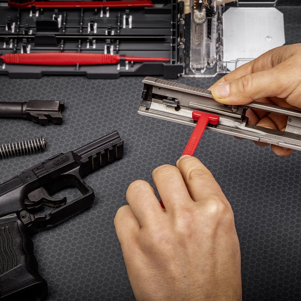 Zestaw wyposażony jest we wszystkie narzędzia potrzebne do czyszczenia lufy, iglicy i komory.